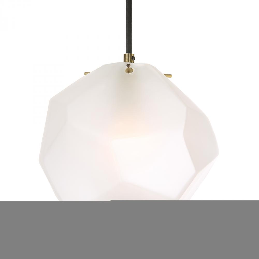 Frosted 8" Geometric Shaped Glass Gives Us The Focal Point for This Celestial Feeling 1 Lt. Pendant Accented with A Rich Matte Antique Brass Finish. 1-60 Watt Max Candelabra Socket. Bulb Not Included. Supplied with 15' of Black Fabric Covered Wire for Adjustable Installation.