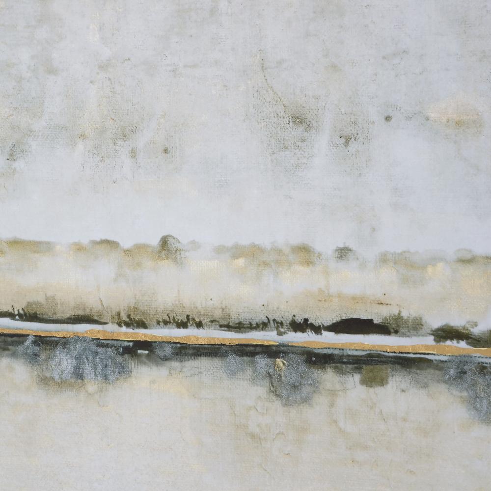 The Gilded Horizon Framed Print Depicts An Abstract Landscape in A Versatile Neutral Palette with Gold Leaf Highlights. An Antique Gold Leaf Frame with A Matte Black Inner Liner Accentuates The Print. Artwork By Tim O'Toole.