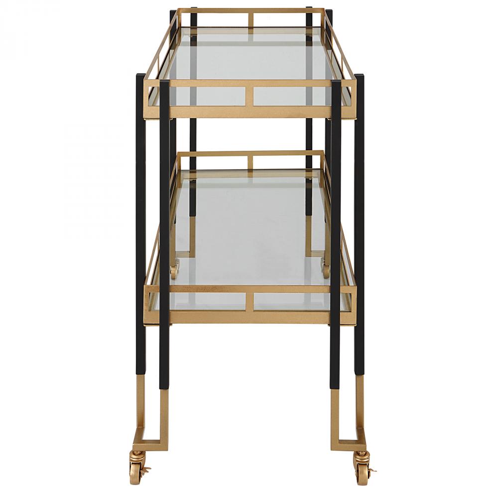 Featuring A Clean Lined Solid Iron Frame, This Contemporary Bar Cart is Finished in A Two-toned Matte Black and Gold Leaf. Has Two Tempered Glass Shelves, Complete with Rolling and Locking Casters.