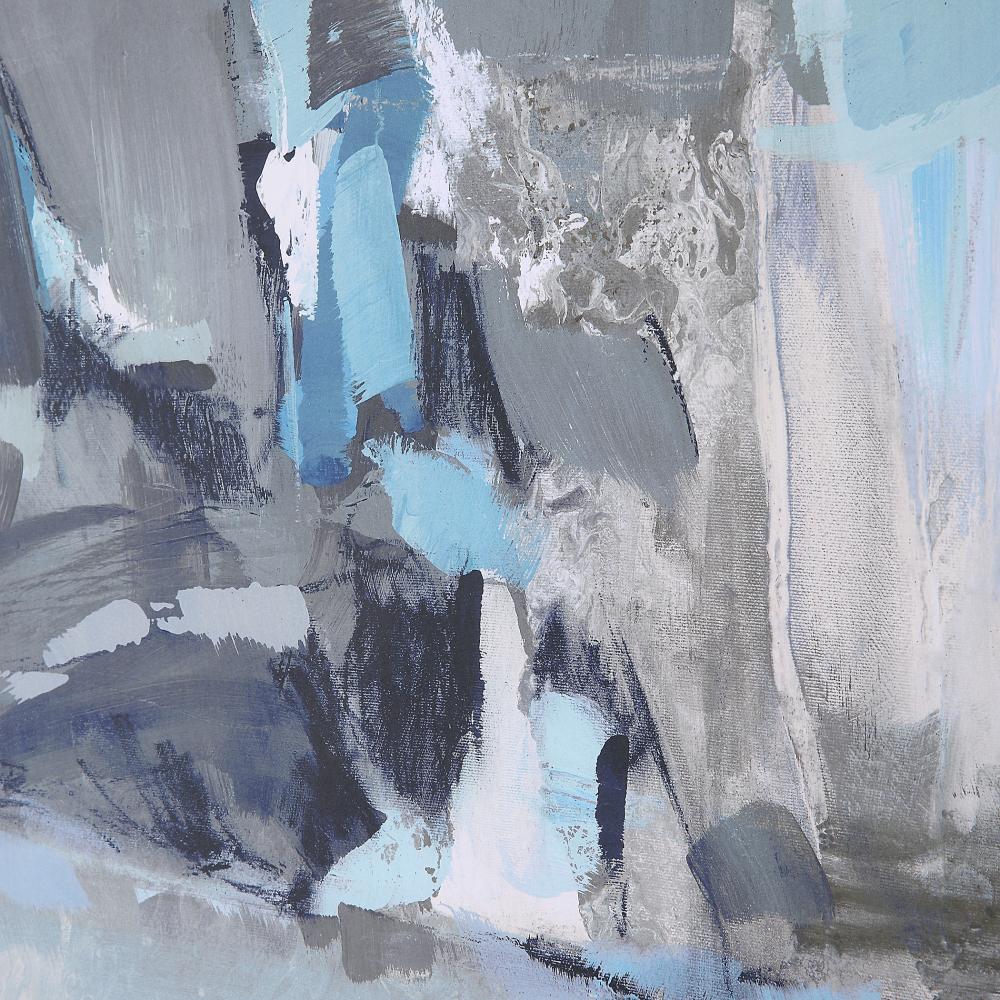 Misty Moonlight is A Stunning Abstract Study Combining Cool Pewter Gray and White with Punches of Cobalt and Powder Blue. Surrounded By A Naturally Finished Pine Wood Frame and Fillet with A Satin White Mat. Printed on Paper with Special Matte Finish. Artwork By Grace Rowan.