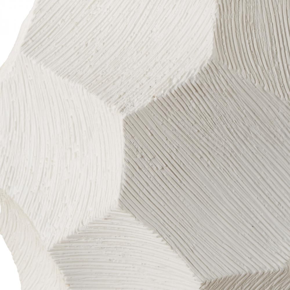 Featuring A Chunky Ceramic Base With Pronounced Ribbed Texture And Sharply Faceted Edges. Finished In A Subtle Chalk White Glaze And Accented With Plated Antique Brass Details. A Slightly Tapered Round Shade Made With A Crisp White Linen Fabric Completes The Piece.