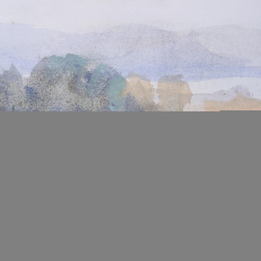 River Afternoon Framed Print Captures A Serene River Landscape In Shades Of Pastel Blue, Olive And Rust, Encased In A Warm Chestnut Frame Accented By An Off-white Linen Liner. Artwork By Danhui Nai.