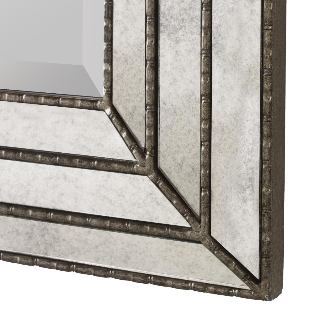 This Mirror Features A Frame Made of Antiqued Mirror Inlays with Burnished Silver Details. Center Mirror Features A Generous 1 1/4" Bevel. May Be Hung Horizontal or Vertical.