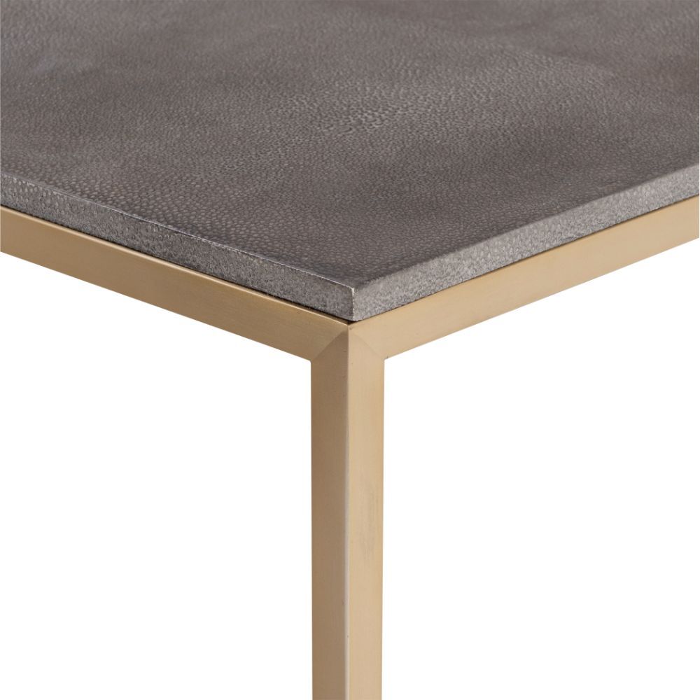 Inspired By Modern Styling, This Coffee Table Features A Beveled Faux Shagreen Wrapped Top in Charcoal Gray Paired with A Sleek Stainless Steel Base Finished in Brushed Brass.
