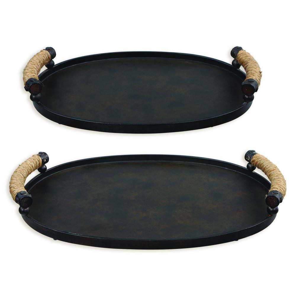This Set of Iron Trays is Finished in A Rustic Oxidized Bronze Finish with Natural Rope Wrapped Handles. Sizes: S-19x3x13, L-22x3x15