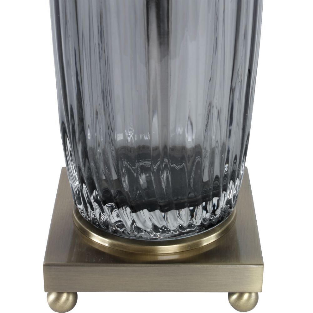 Grooved, Transparent Charcoal Gray Glass Accented with Antiqued Brass Plated Details. The Round Hardback Drum Shade is A Light Beige with Natural Slubbing.