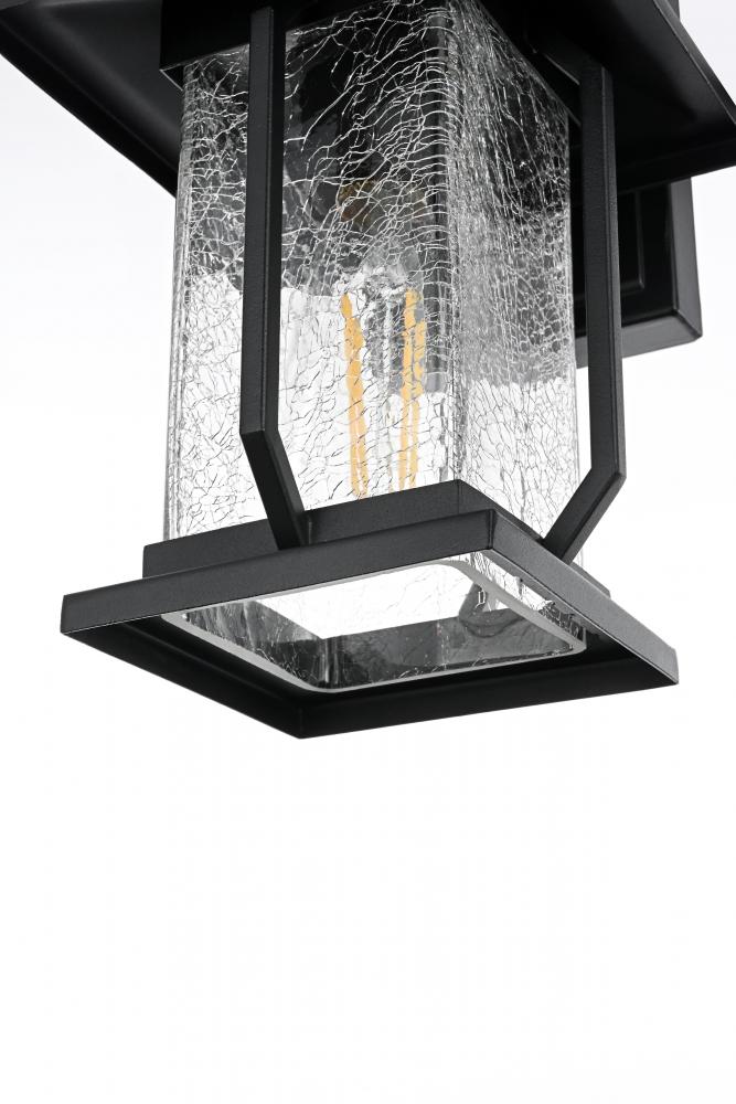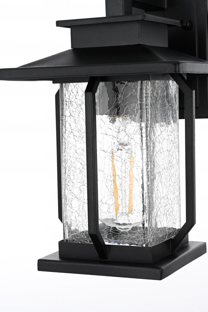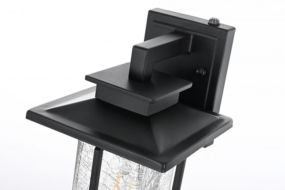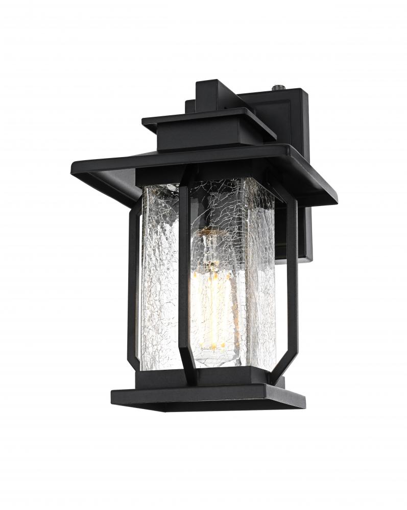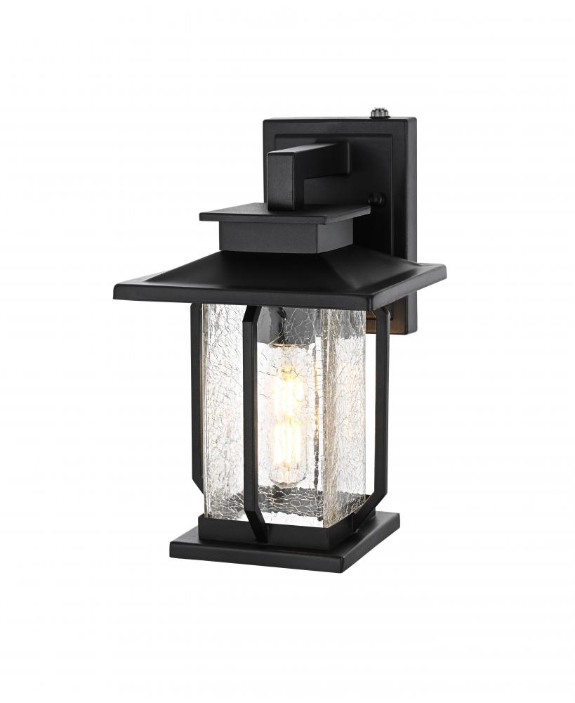Transform your home's exterior with this charming craftsman-style wall sconce. Built with a durable iron frame and finished in a sleek matte black, this sconce adds character to your entryways, patios, or porches. The crackle glass panels create a unique, diffused lighting effect, giving your home a warm and welcoming glow. Featuring a dusk to dawn sensor, this light automatically adjusts to provide illumination exactly when you need it, offering both convenience and energy savings. Designed to endure outdoor conditions, this wall sconce is both a stylish and practical addition to your outdoor space, ensuring a well-lit, safe, and attractive home environment.